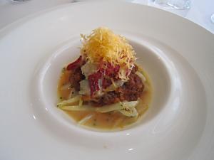 ミソのグラタン、サラダ仕立て、そして、ホワイトアスパラをパスタに見立てた、